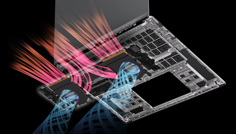 Цей стильний та компактний пристрій вражає своєю продуктивністю. Товщиною всього 13,9 мм та вагою 1,46 кг, цей 15,3-дюймовий монстр відчувається як 14-дюймовий ноутбук. При цьому він забезпечує відведення теплової потужності (TDP) на рівні 30 Вт. Як це можливо? Вся справа в продуманій конструкції, оптимізації внутрішніх потоків повітря, корпусі з магнієвого сплаву та ультратонких друкованих платах товщиною 3 мм. Все це дає приріст продуктивності без необхідності збільшення габаритів.