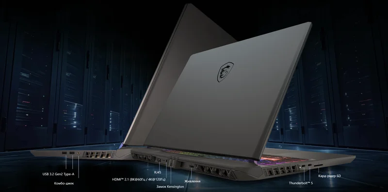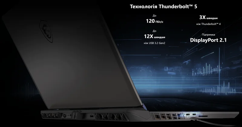 Vector 16 HX AI оснащений повним набором портів для передачі даних та виведення відео. Це дає гравцям максимальну гнучкість в користуванні ноутбуком.