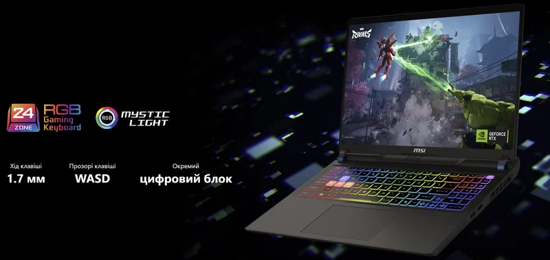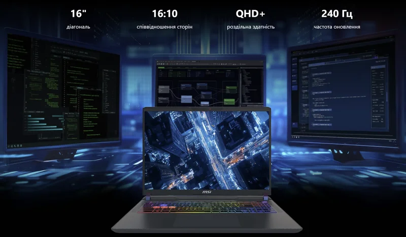 Ігрові ноутбуки MSI створені для геймерів і оснащені екранами з високою роздільною здатністю та частотою оновлення. Завдяки портам HDMI та Thunderbolt 5, цей ноутбук підтримує підключення декілько зовнішніх екранів.