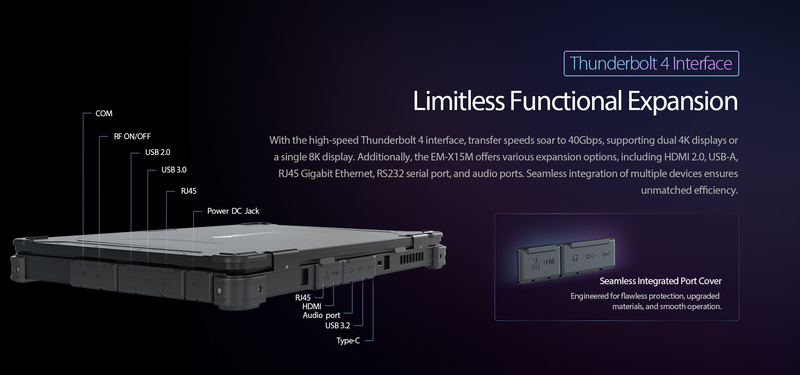Завдяки високошвидкісному інтерфейсу Thunderbolt 4 швидкість передачі даних сягає 40 Гбіт/с, що дозволяє підключати два монітори з роздільною здатністю 4K або один монітор з роздільною здатністю 8K. Крім того, ноутбук пропонує різні можливості розширення, включаючи HDMI 2.0, USB-A, гігабітний Ethernet (RJ45), послідовний порт RS232 та аудіопорти. Бездоганна інтеграція декількох пристроїв забезпечує неперевершену ефективність.