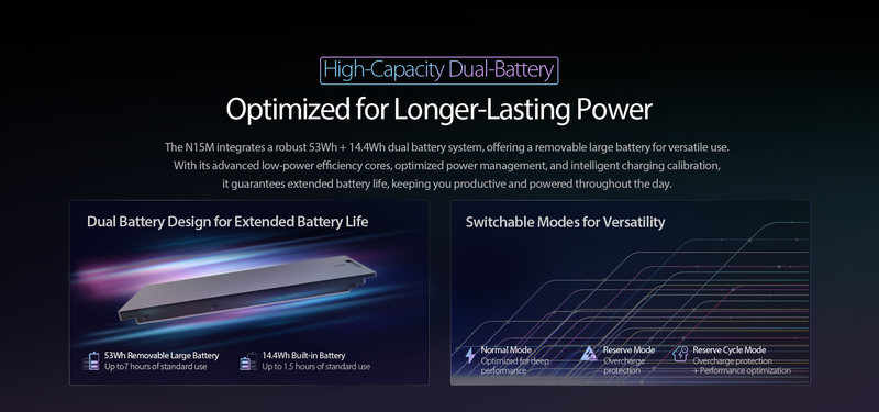 Модель N15M оснащена надійною подвійною акумуляторною системою ємністю 53 Вт·год + 14,4 Вт·год, що включає знімний акумулятор великої ємності, який забезпечує широкі можливості використання. Завдяки передовим енергоефективним ядрам, оптимізованому управлінню живленням та інтелектуальній калібруванню зарядки пристрій гарантує тривалий час автономної роботи, дозволяючи вам залишатися продуктивними та не мати проблем із живленням протягом усього дня.