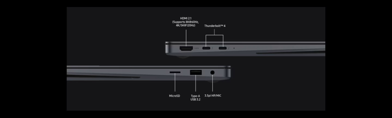Легко підключайтеся до інших пристроїв за допомогою різних портів. Підключайтеся відразу після розпакування за допомогою HDMI, USB-A і microSD, а також двох портів Thunderbolt 4 для швидкої передачі файлів зі швидкістю 40 Гбіт/с.