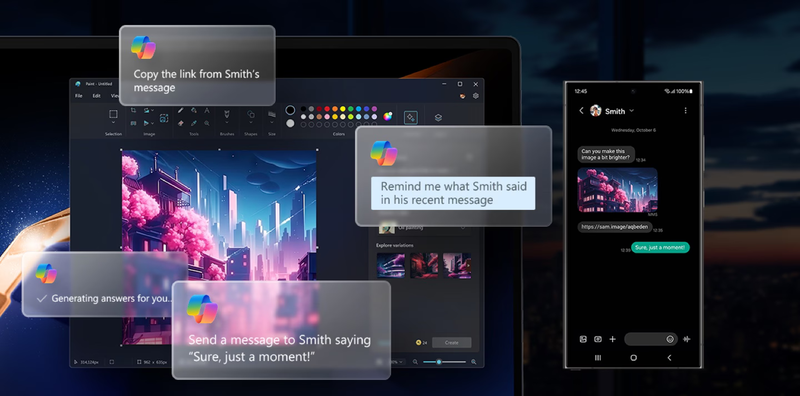 Microsoft Copilot перетворює ваші запити на дії за допомогою простих команд у чаті. Підключіть свій телефон Galaxy до Copilot, щоб отримати персоналізовану допомогу штучного інтелекту, який може керувати завданнями, підсумовувати повідомлення і навіть надсилати текстові повідомлення прямо з вашого ПК.