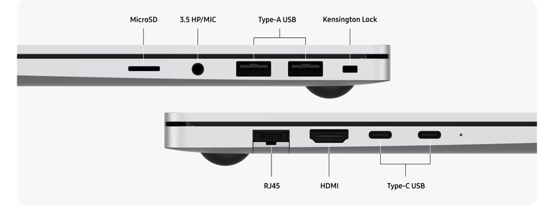 Підключайте свої пристрої безпосередньо, без донглів. Galaxy Book5 має всі необхідні порти, будь то для передачі файлів або підключення аксесуарів. Пориньте в ігровий процес ще глибше, підключивши зовнішній ігровий монітор. Крім того, в пристрої є порт для карти microSD, якщо вам знадобиться додаткове місце для зберігання даних.