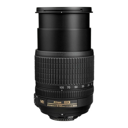 Універсальний зум-об'єктив Nikon AF-S 18-105mm f/3.5-5.6G ED VR DX охоплює досить практичний, майже шестиразовий (5.8х) діапазон фокусних відстаней (27 - 157.5 мм в 35-мм екв.) від ширококутного телефото. Це дозволяє з успіхом використовувати об'єктив для зйомки практично в будь-яких жанрах (портрет, пейзаж, репортаж, архітектура, фотополювання та ін.). Модель має чудове співвідношення ціни та якості, а її характеристики оптимізовані для роботи з цифровими камерами. Серед інших переваг об'єктива слід згадати простоту та зручність у використанні, а також компактність та невелику вагу (76х89 мм, 450 г). Все це робить 18-105mm f/3.5-5.6 DX ідеальним супутником для будь-якої подорожі. Модель виконана в міцному корпусі із пластику з приємним на дотик замшевим покриттям і точно відповідає дизайну останнім цифровим дзеркальним камерам Nikon.