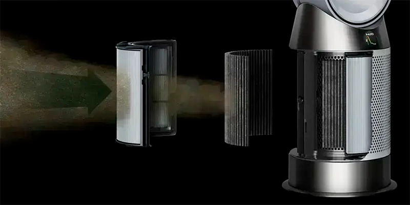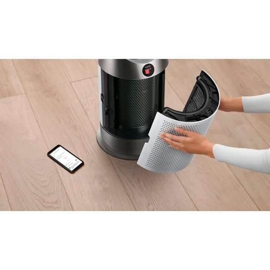 Заміна HEPA-фільтра та фільтра з активованим вугіллям здійснюється швидко та без труднощів. Пристрій повідомляє про необхідність заміни за допомогою РК-дисплея або програми MyDyson.