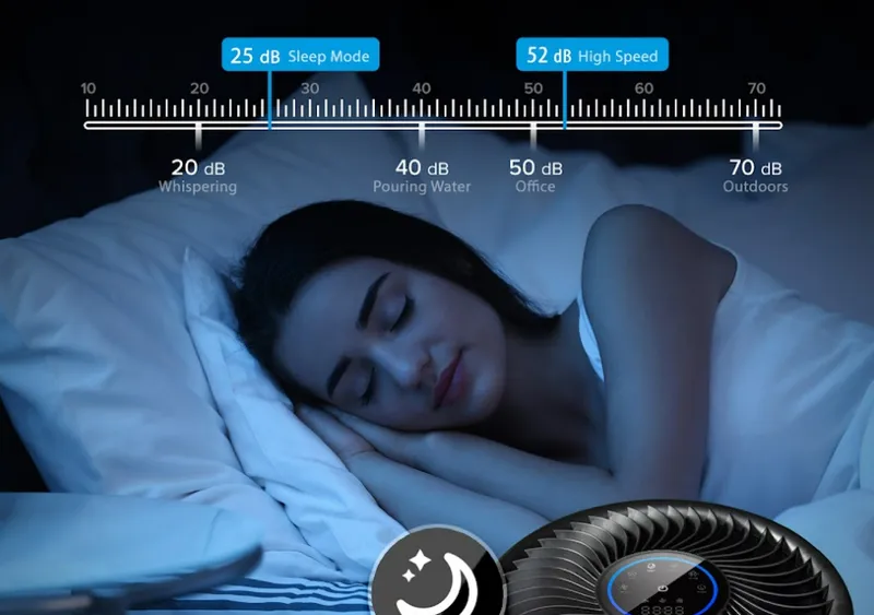 Забезпечте комфортне середовище з очищувачем повітря Levoit, який пропонує режим сну. Він зменшує яскравість індикаторів дисплея та забезпечує низький рівень шуму, що дозволяє вам насолоджуватись спокійним відпочинком.