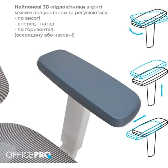 Для зручності рук передбачені нейлонові 3D підлокітники, покриті м'яким поліуретаном, що регулюються по висоті, вперед-назад та по горизонталі. Нейлонова база та прогумовані колеса розміром 60 мм забезпечують стійкість та легкість пересування.