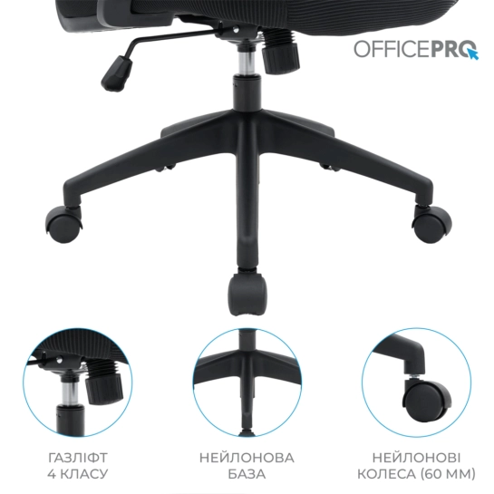Міцна конструкція включає газліфт 4 класу та нейлонові колеса діаметром 60 мм для стабільності та рухливості. Регулювання висоти сидіння та підголівника дозволяє адаптувати крісло під будь-які потреби.