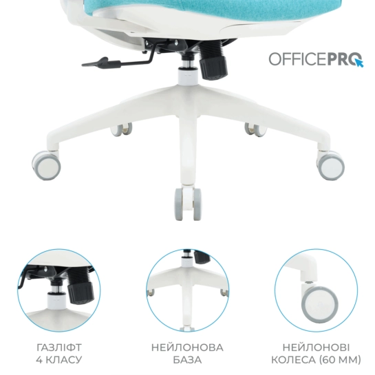 Міцна конструкція включає газліфт 4 класу та нейлонові колеса діаметром 60 мм для стабільності та рухливості. Регулювання висоти сидіння та підголівника дозволяє адаптувати крісло під будь-які потреби.