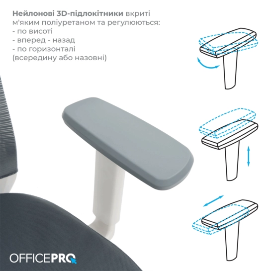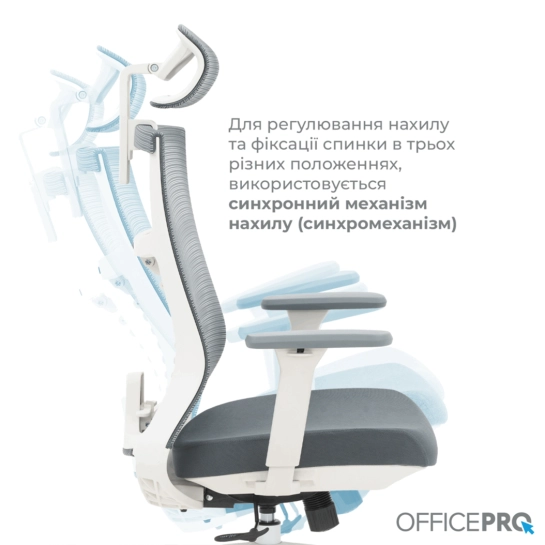 Крісло має повністю регульовані 3D підлокітники, які налаштовуються по висоті, горизонталі та вперед-назад. Синхромеханізм дозволяє фіксувати спинку в 3 положеннях нахилу, а функція гойдання з регулюванням жорсткості забезпечує оптимальне розслаблення.