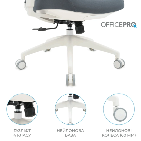 Міцна конструкція включає газліфт 4 класу та нейлонові колеса діаметром 60 мм для стабільності та рухливості. Регулювання висоти сидіння та підголівника дозволяє адаптувати крісло під будь-які потреби.