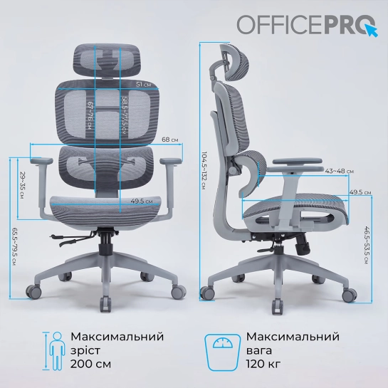 | Регулювання: | Кут нахилу спинки, Глибина сидіння, Кут нахилу сидіння, Кут нахилу підголівника, Висота підголівника, Висота підлокітників, Жорсткість гойдання, Висота сидіння, Висота спинки, Механізм хитання, Кут повороту підлокітників |