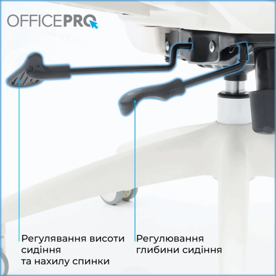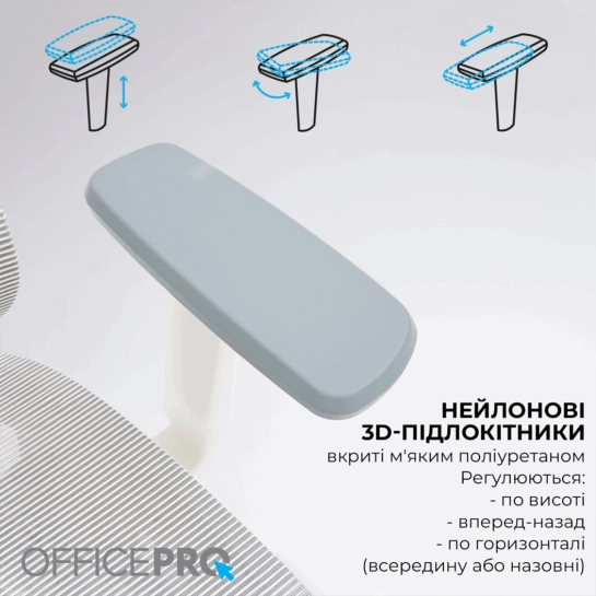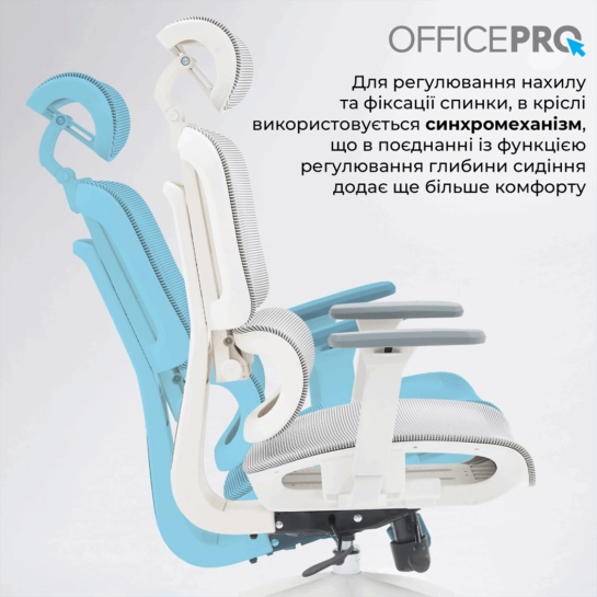 Регульована поперекова підтримка забезпечує ергономічну підтримку нижньої частини спини, щоб запобігти перенапрузі при тривалому сидінні. Кут нахилу та висота підголовника регулюється для оптимального позиціонування. А завдяки регулюванню спинки висотою ви можете налаштувати зручне положення спинки для свого зростання. Нейлонові 3D підлокітники, покриті м'яким поліуретаном, регулюються по висоті, вперед-назад і змінюють кут повороту по горизонталі (назовні або всередину). Для регулювання нахилу та фіксації спинки у кріслі використовується синхромеханіз, що у поєднанні з функцією регулювання глибини сидіння надає ще більше комфорту.
