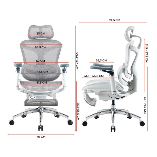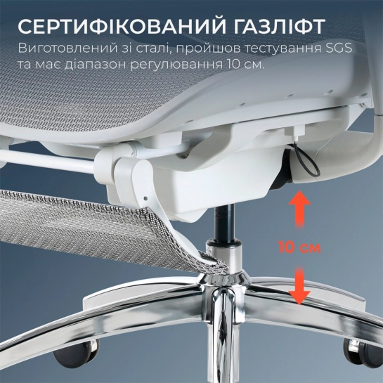 | Регулювання: | Кут нахилу спинки, Глибина сидіння, Кут нахилу сидіння, Підтримка ніг, Кут нахилу підголівника, Висота підголівника, Висота підлокітників, Висота сидіння, Відстань підлокітників, Висота спинки, Кут нахилу підлокітників, Кут повороту підлокітників |