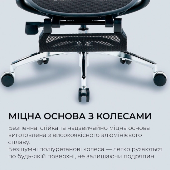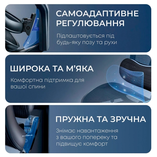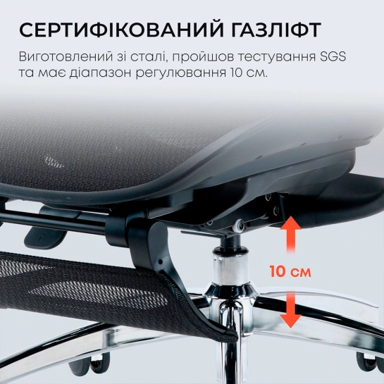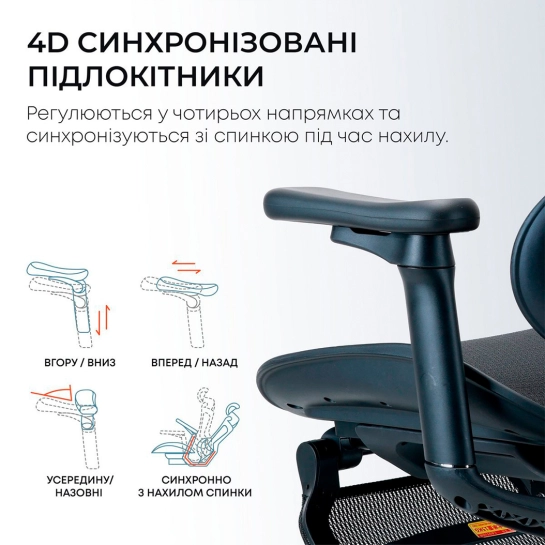 Підлокітники 4D регулюються по висоті, переміщаються вперед/назад, убік і синхронізуються з кутом нахилу спинки, забезпечуючи максимальний комфорт. Підголовник, що регулюється по висоті, глибині та куту нахилу, зменшує напругу в шиї. Сидіння у формі «водоспаду» зменшує тиск на стегна, а сітка, що дихає, забезпечує чудову вентиляцію і довговічність матеріалів.