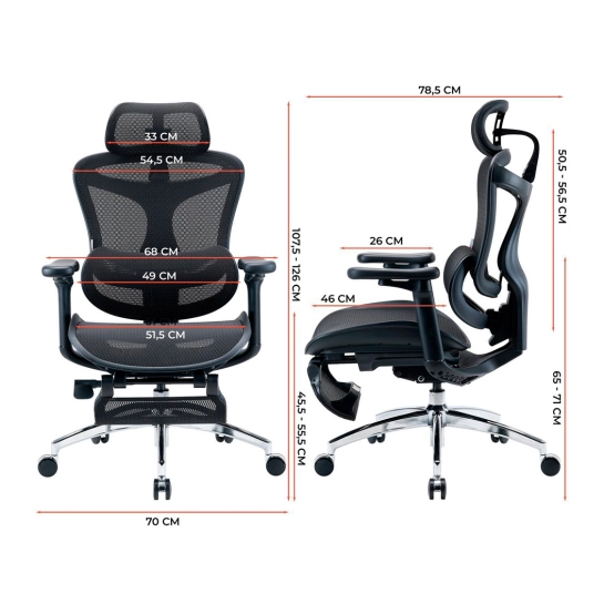 | Регулювання: | Кут нахилу спинки, Глибина сидіння, Кут нахилу сидіння, Підтримка ніг, Кут нахилу підголівника, Висота підголівника, Висота підлокітників, Висота сидіння, Відстань підлокітників, Висота спинки, Кут повороту підлокітників |