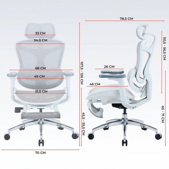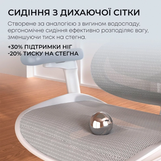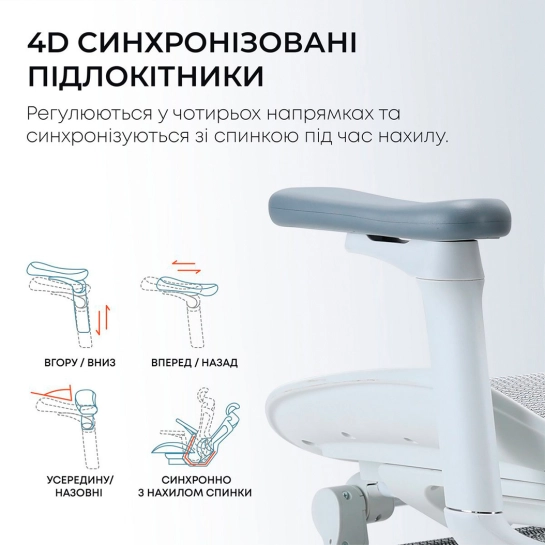 Підлокітники 4D регулюються по висоті, переміщаються вперед/назад, убік і синхронізуються з кутом нахилу спинки, забезпечуючи максимальний комфорт. Підголовник, що регулюється по висоті, глибині та куту нахилу, зменшує напругу в шиї. Сидіння у формі «водоспаду» зменшує тиск на стегна, а сітка, що дихає, забезпечує чудову вентиляцію і довговічність матеріалів.