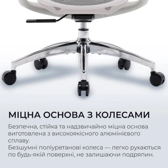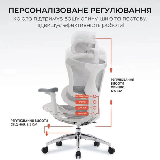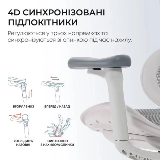 Підлокітники 4D регулюються по висоті, переміщаються вперед/назад, убік і синхронізуються з кутом нахилу спинки, забезпечуючи максимальний комфорт. Підголовник, що регулюється по висоті, глибині та куту нахилу, зменшує напругу в шиї. Сидіння у формі «водоспаду» зменшує тиск на стегна, а сітка, що дихає, забезпечує чудову вентиляцію і довговічність матеріалів.
