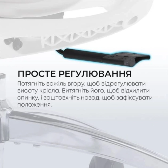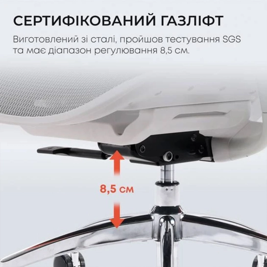 | Регулювання: | Кут нахилу спинки, Глибина сидіння, Кут нахилу сидіння, Кут нахилу підголівника, Висота підголівника, Висота підлокітників, Висота сидіння, Відстань підлокітників, Висота спинки, Кут повороту підлокітників |