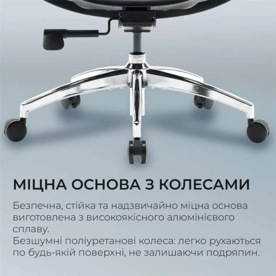 Крісло витримує навантаження до 125 кг та підходить для зростання від 150 до 195 см. Воно оснащене надійною базою та плавними колесами для легкого переміщення. Всі елементи регулювання є інтуїтивними, що дозволяє швидко налаштувати крісло під індивідуальні потреби.