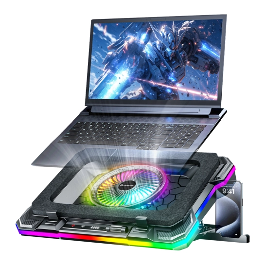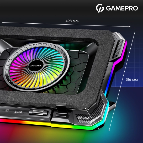 GamePro CP950 – це інноваційне рішення для активного охолодження ноутбука, що поєднує у собі високу продуктивність, передові технології та яскравий дизайн. Завдяки надпотужному вентилятору діаметром 140 мм, вона забезпечує необхідний потік повітря для ефективного зниження температури ноутбука, навіть під час інтенсивних навантажень.