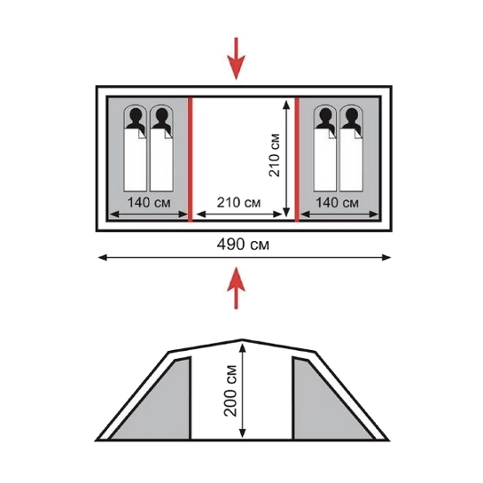 - Двокімнатна компановка намету, кожен з двох житлових відсіків розмірами 2,20 на 1,40 м і висотою до 1,65 метра;