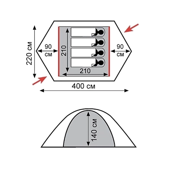 - Два вентиляційних вікна з можливістю відкриття зсередини намету;