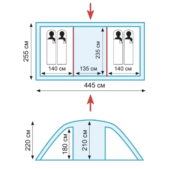 - Двошаровий кемпінговий намет з двома спальними відділеннями;