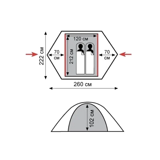 - Двошаровий намет з двома входами і 2 тамбурами;