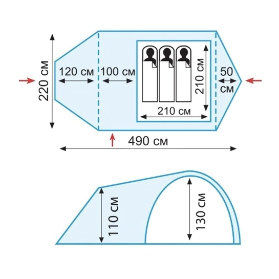 Універсальна туристична палатка з 3 входами (2 через тамбур - бічній і торцевій, і один з тильного боку) і великим вантажним переднім тамбуром. Всі входи в спальне відділення продубльовані москітними сітками. Місткість намети 3 + 1 людини.