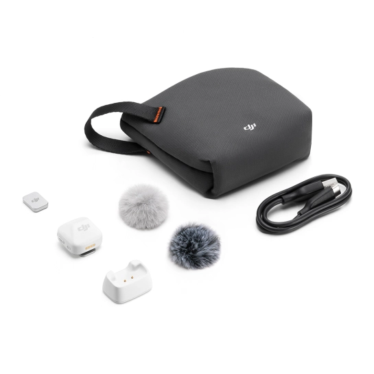 Комплектація: 1 передавач (чорний), 1 приймач, 1 зарядна док-станція, 1 аудіокабель для міні-камери DJI Mic (3,5 мм TRS), 1 адаптер для мобільного телефону (Type-C), 1 кабель для заряджання Splitter, 1 вітрозахист (сіра), 1 вітрозахист (чорна), 1 магнітний затискач для мікрофона, 1 сумка для перенесення.