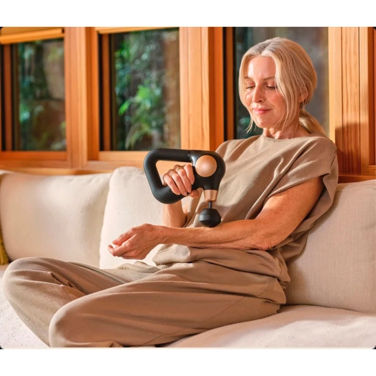 - Запатентована трикутна рукоятка Theragun, що дозволяє охопити більшу частину тіла, ніж інші пристрої;