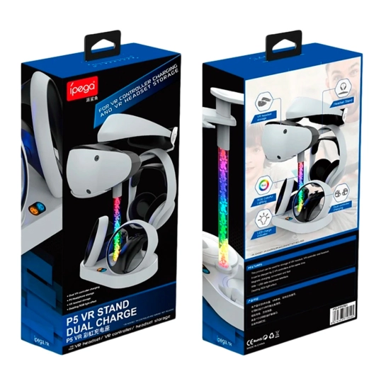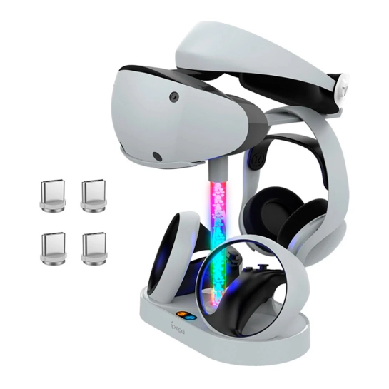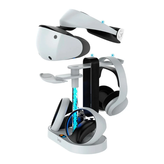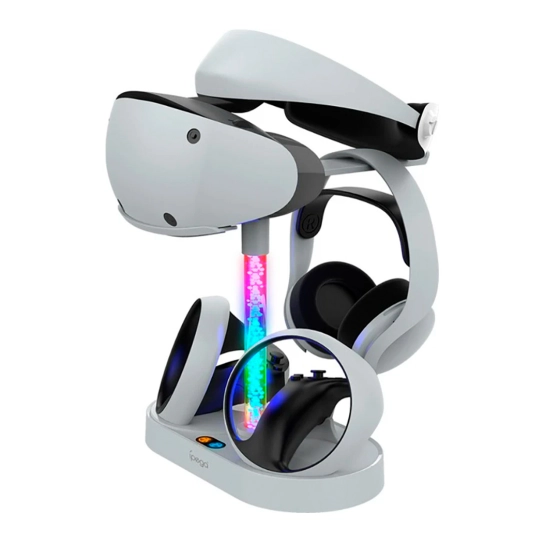 Багатофункціональна підставка iPega PG-P5V001 – це стильне та зручне рішення для власників PSVR2, що поєднує в собі функції заряджання та зберігання VR-контролерів та ігрової гарнітури.