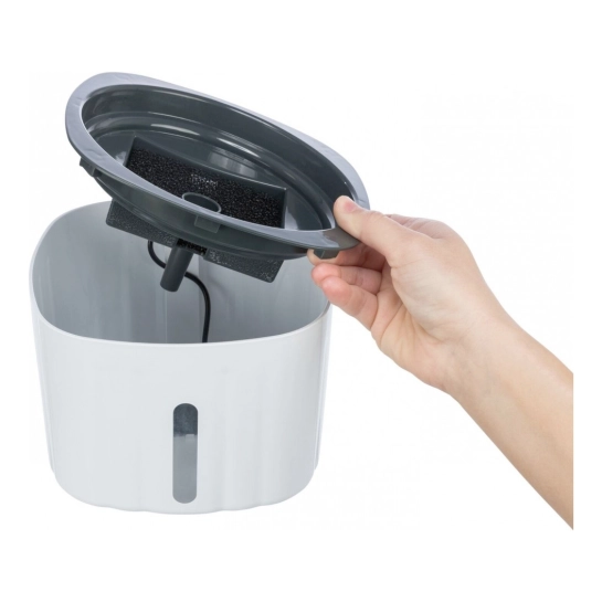 Поїлка-фонтан Flower відрізняється стильним мінімалістичним дизайном у біло-сірій кольоровій гамі, який органічно доповнює будь-який житловий простір. Компактна квадратна форма оптимально використовує простір, займаючи мінімальну площу при максимальній функціональності. Назва моделі відображає природну естетику пристрою, що створює ефект природного джерела води, привабливого для кішачих інстинктів.