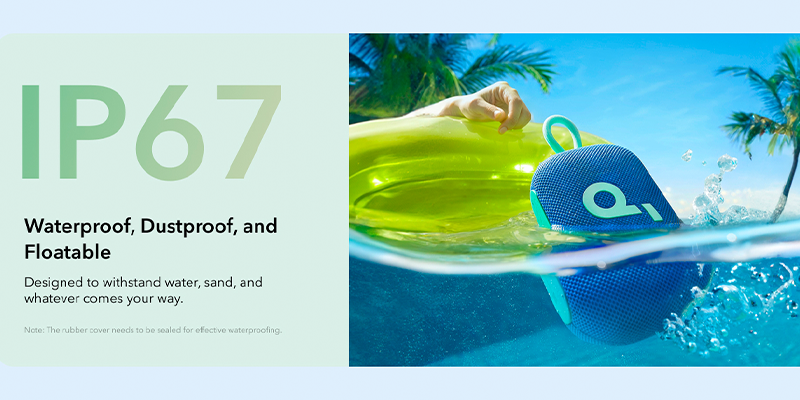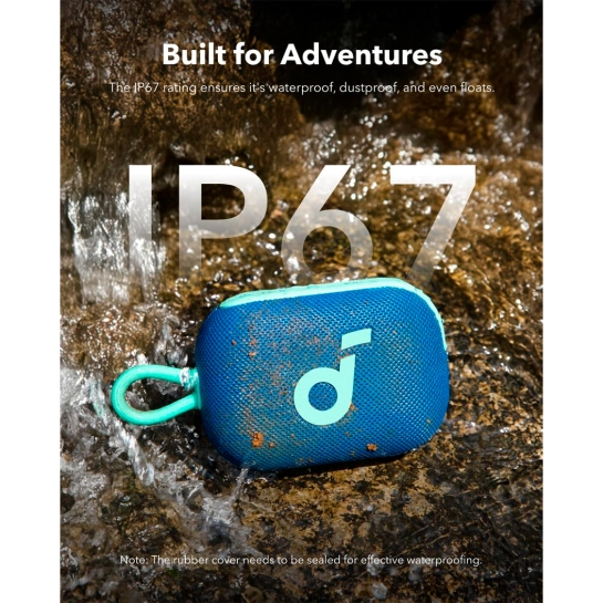 Завдяки рейтингу IP67 цей портативний динамік має повний захист від пилу та води, витримує суворі умови на відкритому повітрі і навіть може плавати, що робить її ідеальною для подорожей на пляж.