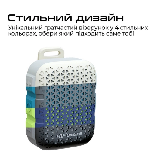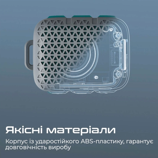 Корпус виконаний з удароміцного ABS-пластику, що забезпечує додаткову стійкість до випадкових ударів або падінь. На корпусі розташовані три вбудовані кнопки управління — вмикання/вимикання, перемикання треків, регулювання гучності — все інтуїтивно зрозуміло і зручно навіть для початківців користувачів або дітей. Унікальна решітка-візерунок робить зовнішній вигляд привабливим, а магнітна кліпса дозволяє закріпити колонку практично на будь-якій поверхні або аксесуарі.