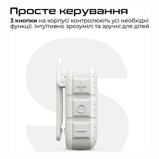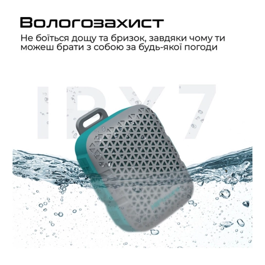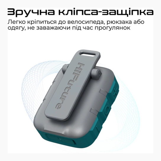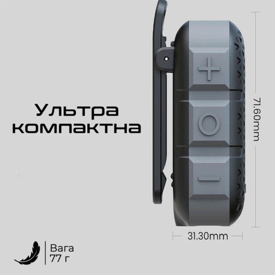 Колонка важить усього близько 77 г і має розміри приблизно 70 × 30 × 30 мм — майже не відчувається в сумці або рюкзаку. Завдяки невеликим габаритам і легкій вазі пристрій зручно кріпити кліпсою-защілкою до рюкзака, пояса або велосипеда — ідеальне рішення для активного способу життя.