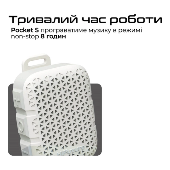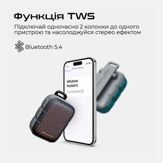 Незважаючи на компактні розміри, Pocket-S пропонує вихідну потужність 5 Вт — достатньо, щоб наповнити звуком невелике приміщення, поїздку на природу або фоновою музикою робочу зону. Підключення здійснюється через Bluetooth версії 5.4, що забезпечує стабільне бездротове з'єднання та сумісність із сучасними смартфонами, планшетами та іншими пристроями. Крім того, реалізована можливість TWS-режиму (True Wireless Stereo) — пара таких колонок може працювати як стерео-пара, створюючи ширший звуковий ефект.