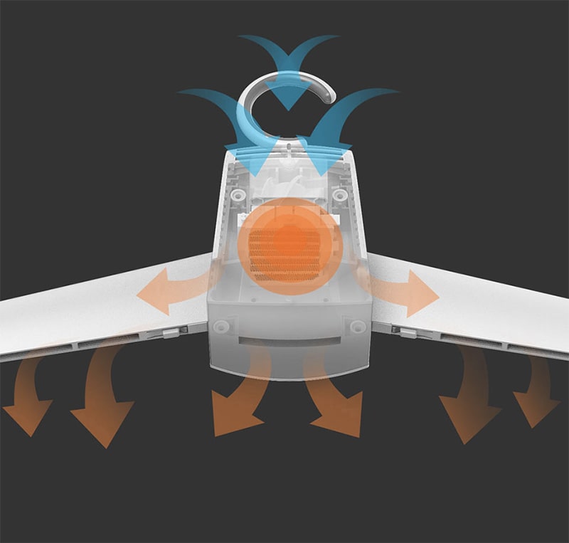 Пристрій сушить одяг за допомогою потоку нагрітого повітря, яке нагрівається до 50-60 градусів цельсія за допомогою потужного керамічного РТС-нагрівача. Завдяки спеціальній запатентованій конструкції повітропроводів, повітря поширюється рівномірно, забезпечуючи якісну і швидку сушку одягу. Після завершення сушіння пристрій автоматично переключиться на холодний обдув, щоб ви могли, при бажанні, відразу ж надіти висушенний одяг.