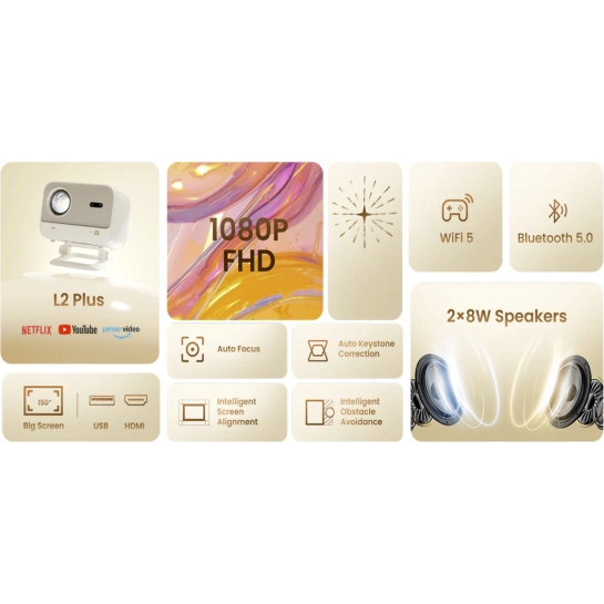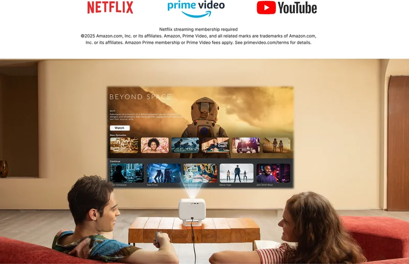 Ліцензований Netflix, Prime Video з Smart OS — від популярних телешоу до класичних фільмів, ви можете зануритися у високоякісний контент у будь-який час і в будь-якому місці. Чи то для спокійних вихідних, чи то для короткої перерви протягом дня, цей проєктор для потокового відтворення відкриває для вас двері у світ розваг.