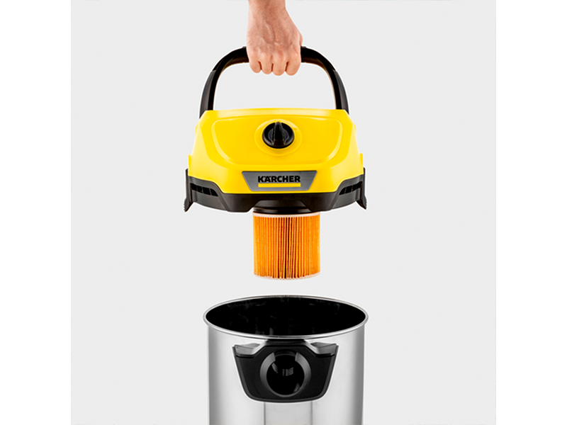 Енергоефективний апарат WD 3 V-17/4/20 розвиває високу силу всмоктування при низькій споживаній потужності (лише 1000 Вт). При цьому він оптимально поєднується з шлангом, що всмоктує, і забезпеченою вставками насадкою для підлоги, завдяки чому забезпечуються чудові результати збору будь-якого сміття - сухого або вологого, великого або дрібного. Цей господарський пилосос, що вражає своєю компактністю, оснащений міцним 17-літровим пластиковим сміттєзбірником, 4-метровим кабелем, 2-метровим шлангом, що всмоктує, і фільтр-мішком з нетканого матеріалу. Завдяки нерозбірному патронному фільтру він дозволяє чергувати операції вологого та сухого прибирання без заміни фільтра. Функція видування значно полегшує очищення важкодоступних місць. Для компактного зберігання апарата шланг підвішується на моторній частині, кабель – на спеціальному гаку, а подовжувальні трубки та насадка для підлоги закріплюються на відбійнику. Замки Pull & Push дозволяють дуже легко приєднувати та від'єднувати сміттєзбірник. Рукоятка може зніматися з шланга, що всмоктує, для прикріплення насадок безпосередньо до нього. Продумана і конструкція моторної частини: на її плоску панель можуть укладатися інструменти та дрібні деталі, а ручка ергономічної форми забезпечує зручне перенесення апарату.