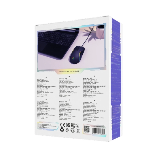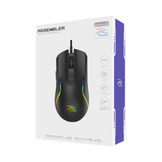 Миша Proove Gaming Asembler працює за допомогою 1.5-метрового USB-дроту, який під'єднується до комп'ютера або ноутбука. Таким чином, час використання аксесуара може бути необмеженим. Додаткові клавіші дають змогу регулювати швидкість руху миші та перемикатися між сторінками.