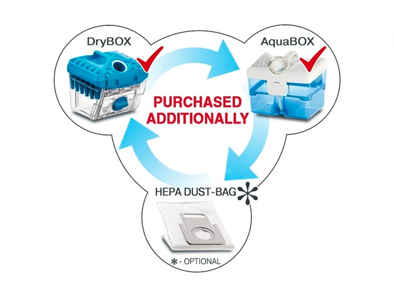 Унікальне поєднання водяного фільтру AquaBOX із системою пилоподавлення Wet-Jet забезпечує 100% утримання пилку та 99,99% утримання пилу. У процесі збирання очищаються не тільки всі поверхні, а й "миється" повітря в приміщенні.