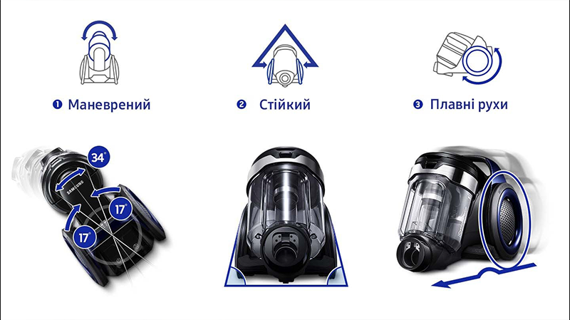 Цей пилосос відрізняється революційним дизайном Motion Sync Design™, у якому поворотний корпус відокремлений від коліс, що дозволяє пилососу переміщатися при різких поворотах набагато швидше та простіше. Пилосос оснащений опуклими колесами, які забезпечують більш стійкий рух та запобігають нахилу або перекиданню пилососу. Великі колеса призначені для плавного та швидкого переміщення з додатком мінімальних зусиль.