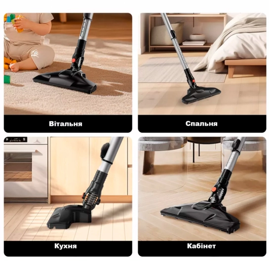 - що ви отримаєте: пилосос, телескопічну трубку, насадку зі щіткою для підлоги, плоску насадку 2-в-1, гачок для підвішування, зарядний пристрій