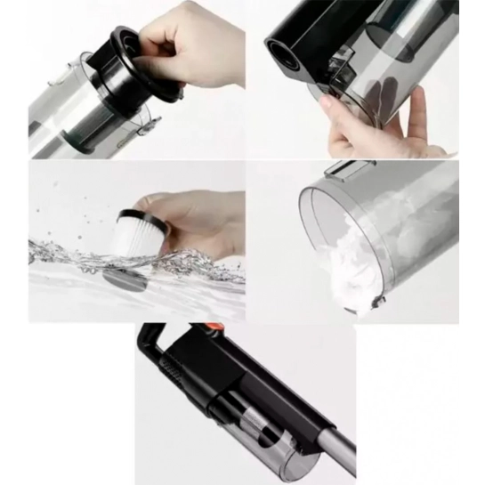 Щоб пилосос генерував максимальну ефективність, важливо регулярно очищати пилозбірник та HEPA-фільтр. Натисніть і утримуйте кнопку розблокування пилозбірника, щоб без зусиль дістати його, а потім висипте пил, що накопичився, у відро. Далі зніміть блок HEPA, який складається з фільтра з нержавіючої сталі та HEPA-фільтра, та промийте кожен елемент чистою водою. Після цього залиште їх сушитися на повітрі протягом 24 годин для повного висихання, і тільки після цього знову встановіть пилозбірник. Після збирання поверніть пилозбірник на основний двигун пристрою. Для підтримки високої продуктивності рекомендується замінювати пилозбірник щомісяця. Наявність HEPA-фільтра дуже важлива для затримування дрібних частинок пилу, алергенів та вовни тварин, щоб повітря в кімнаті було чистим.