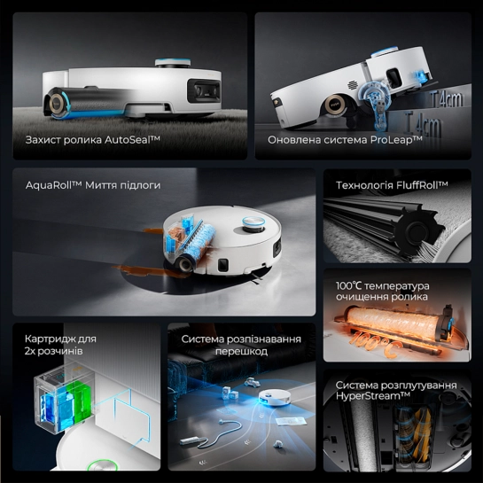Чи діяти для ефектної презентації? Чи для щоденної роботи у живих умовах? Dreame Aqua 10 Ultra Roller Complete - вибрав саме другий сценарій. Він знає, що робити, коли на підлозі крихти після сніданку, у коридорі — сліди від взуття, а шерсть тварин під ліжком грає з вами у хованки. Модель поєднує в собі класичне сухе прибирання, глибоке миття підлоги та повний сервіс на станції без того, щоб ви втручалися в процес вручну. Робот не просто змочує ролик, а подає воду мікродозовано через 24 форсунки, зберігає рівномірну вологість та створює ефект легкого тиску. Датчики оцінюють, який тип покриття перед ним, і пристрій автоматично змінює поведінку: на килимі піднімає шасі, на плитці підвищує тиск, а на дерев'яній підлозі працює делікатніше. При клінінгу під меблями допомагає система DToF, що рухається, а на складних ділянках — бінокулярні камери, які розпізнають об'єкти з точністю до міліметра і не допускають зіткнення з кабелями і дрібними речами. Dreame реагує на ваш голос, виконуючи команди, адаптується до ритму вашого життя, сам повертається на базу, щоб очиститись та відновити сили. А ви просто спостерігаєте, як прибирання нагадує взаємодію двох систем: роботизованого інтелекту і вашого будинку. Особливості Dreame Aqua 10 Roller Complete: