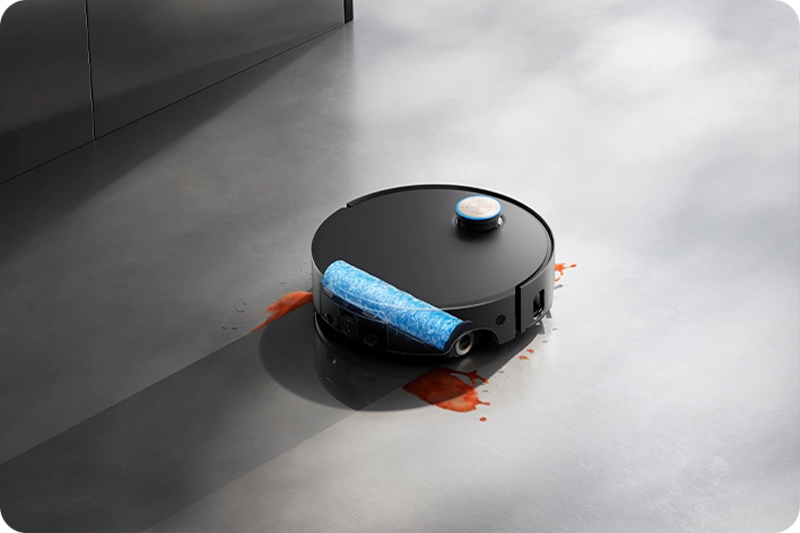 Коли справа стосується миття підлоги, робот-пилосос точно дозує рідину та підлаштовується під покриття. Інноваційна система подачі води з 24 мікрофорсунками подає рідину рівномірно, без протікань і не заливає поверхні. Робот постійно утримує ролик у вологому стані, щоб відтерти бруд без розлучень. Додатково інтелектуальна система тиску підтримує 10 Н, щоб ролик не просто ковзав поверхнею, а фізично прав забруднення з підлоги. 100 об/хв дають стабільний контакт із покриттям: застарілі плями кави на кухні або тонкий шар пилу видаляється за один прохід. Робот не зависає на одній ділянці, не пересушує насадку, не розмазує забруднення - він повторює логіку професійних миючих машин. У режимі глибокого миття форсунки працюють з підвищеною частотою, а для делікатних покриттів програма дозволяє знизити вологість. Перед запуском важливо просто залити чисту воду в бак - решта система зробить сама.