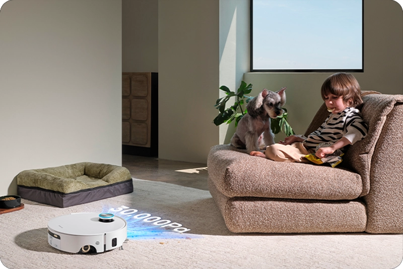 Чи можливе глибоке очищення покриття, включаючи килими із середнім ворсом? Так, і все, що для цього потрібно, — сильний потік повітря. У режимі сухого прибирання пилосос працює з потужністю до 30 000 Па, збирає масивне сміття, наповнювач, шерсть та дрібні частинки на твердому покритті та килимах. Двигун працює тихо (до 65 дБ у стандартному режимі), а рівень всмоктування можна регулювати у додатку Dreamehome - вибравши делікатний режим або глибоке очищення. Перед початком роботи можна встановити автоматичне посилення потужності на килимах – тоді система сама контролює, коли потрібно збільшити тягу, а коли зменшити шум.